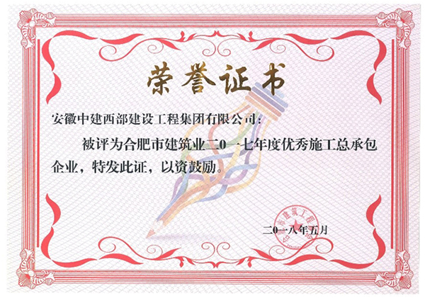 熱烈祝賀中建西部被評為 合肥市建筑業(yè)2017年度優(yōu)秀施工總承包企業(yè)