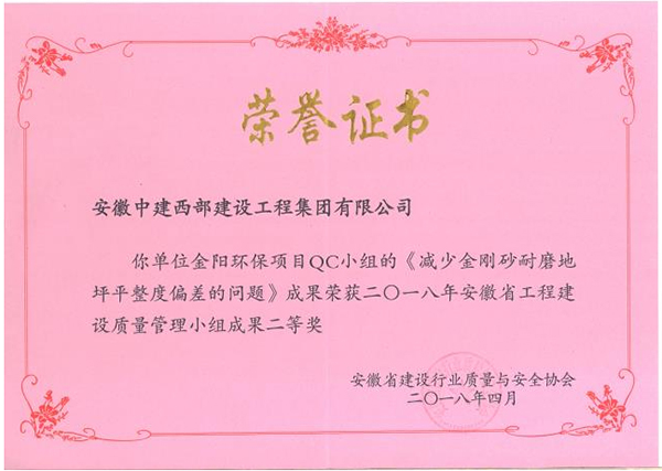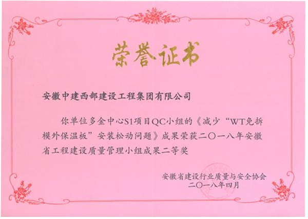 2018年度QC成果榮獲安徽省建筑業優秀質量管理獎項