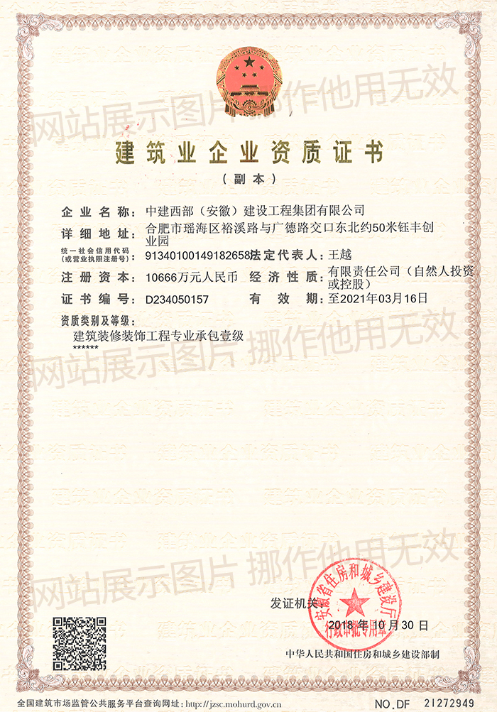 2018年10月,中建西部(安徽)建設工程集團有限公司順利地通過了建筑工程企業資質的審查,是公司繼建筑工程施工總承包壹級、市政公用工程施工總承包叁級資質之后,取得了建筑裝修裝飾工程專業承包壹級資質。