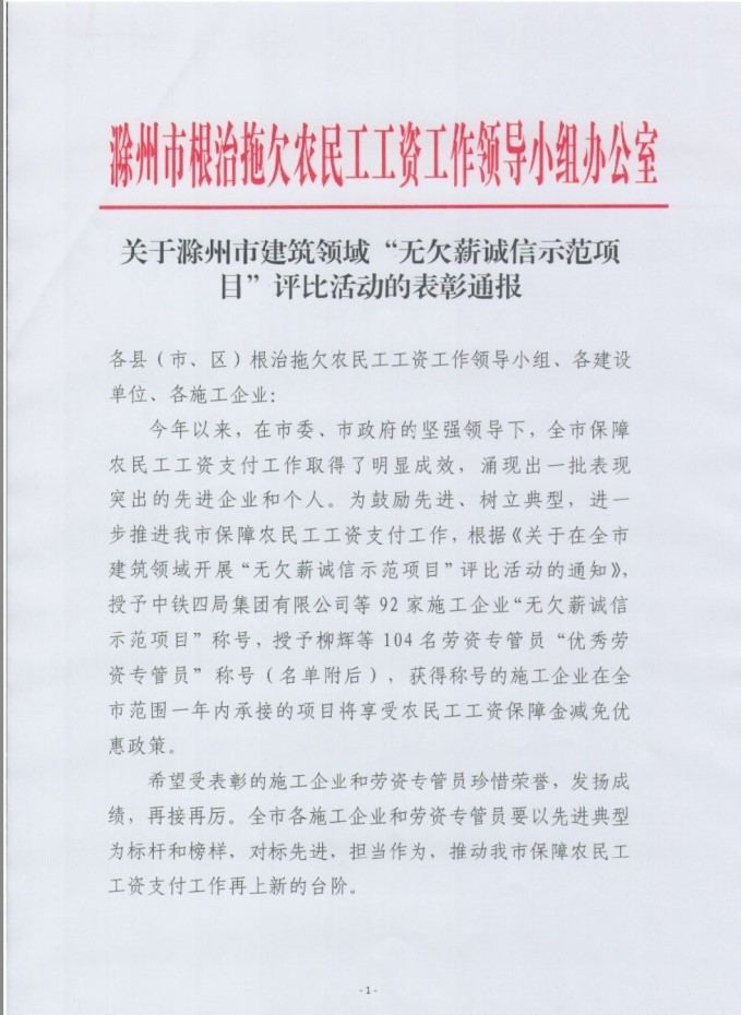近日,喜報連連,中建西部集團承建滁州奧特萊斯儀邦項目獲評滁州市建筑領域“無欠薪誠信示范項目”。滁州市根治拖欠農民工工資工作領導小組辦公室印發《關于滁州市建筑領域“無欠薪誠信示范項目”評比活動的表彰通報》,對我司獲評進行了表彰通報。